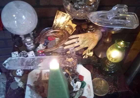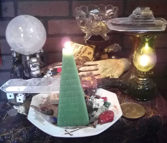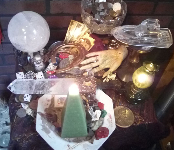 Coins, paper money, gambling chips and other symbols of wealth adorn the altar along with symbols of luck, money charms, and talismans personally constructed by Reverend Saint Germain. The hand of a mannequin was salvaged from a department store belonging to a local millionaire with a family history of business prosperity going all the way back to the early 1800's. Magnetic lodestones along with money-drawing stones like pyrite help increase the attractive power of the shrine. A green pyramid candle, dressed with the appropriate prosperity and attraction oils, is burned. Large quartz crystals amplify the power of the altar even further, making work done on this shrine particularly potent!